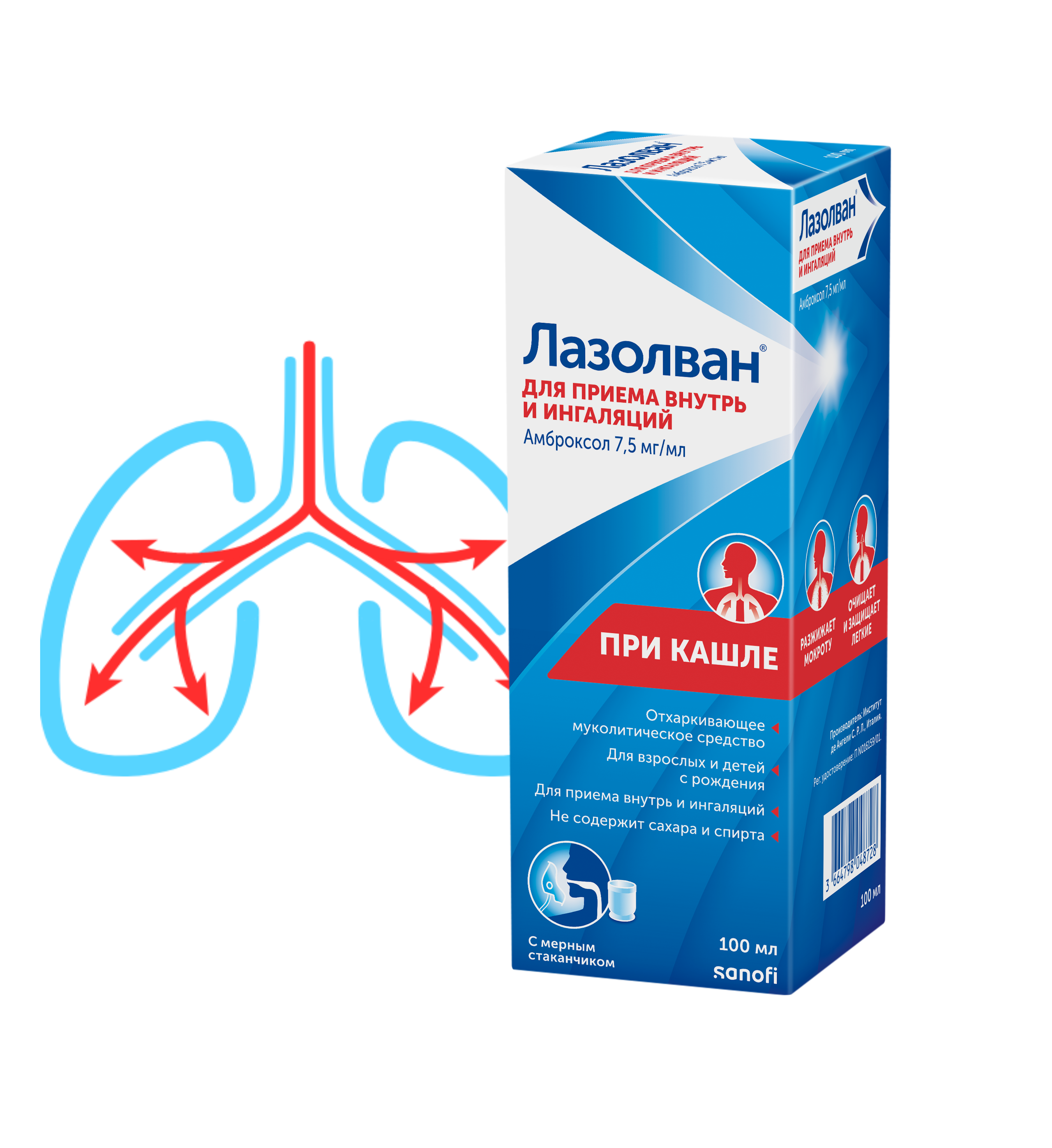 Амброксол — муколитическое средство. Он способствует защите легких, т.к. стимулирует образование сурфактанта— вещества, препятствующего спаданию альвеол, и стимулирует цилиарную активность.5, 6