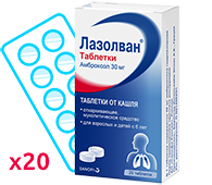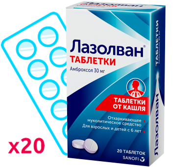 Амброксола гидрохлорид 30 мг — действующее вещество в составе таблеток Лазолван®. В одной таблетке содержится 30 мг амброксола.